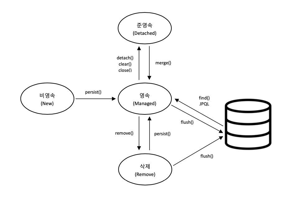 영속성 컨텍스트(persistence context)영속성 컨텍스트란 엔티티를 영구 저장하는 환경이라는 의미입니다.엔티티 매니저로 엔티티를 저장하거나 조회하면 엔티티 매니저는 영속성 컨텍스트에 엔티티를 보관하고 저장합니다.영속성 컨텍스트는 엔티티 매니저를 생성할때 만들어지면 엔티티 매니저를 통해 영속성 컨텍스트에 접근, 관리 할수 있습니다.엔티티의 생명주기 (Life Cycle of Entity)비영속(new/transient) : 영속성 컨텍스트와 전혀 관계가 없는 상태영속(managed) : 영속성 컨텍스트에 저장된 상태준영속(detached) : 영속성 컨텍스트에 저장되었다가 분리된 상태삭제(removed) : 삭제된 상태비영속엔티티 객체를 생성한 상태로 순수한 객체 상태이므로 영속성 컨텍스트나 데..