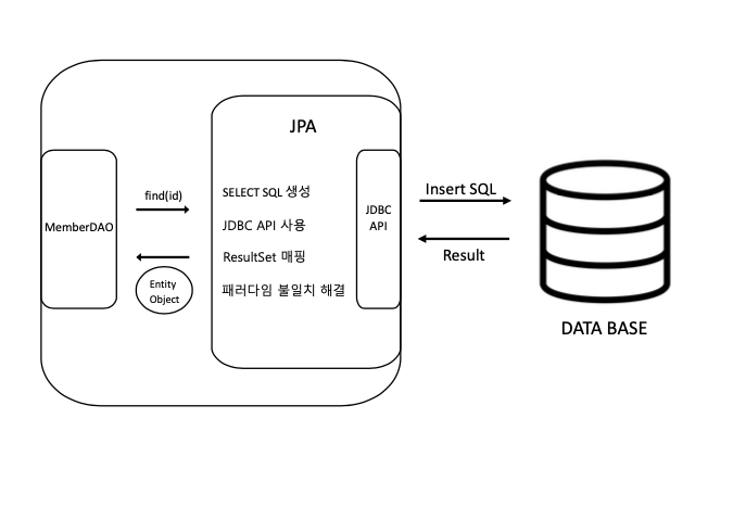find()로 식별자를 넘기면 Member객체를 분석하서 Select SQL을 생성, DB에서 가져온 결과를 객체로 만들어 반환, 패러다임의 불일치를 해결합니다.